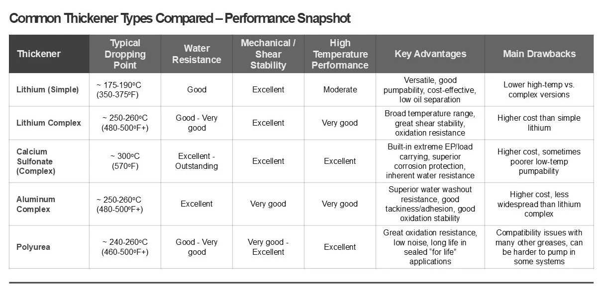 Thickener drives temperature limits, water resistance, load-carrying, and compatibility. Here’s how the most common types stack up: